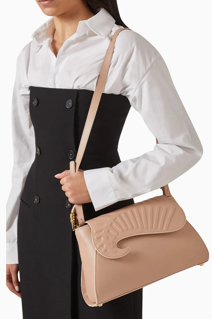 Embracing the serene allure of Arab Gardens, the "Yasmine Bag" draws inspiration from their tranquil essence. Reflecting the beauty of the iconic Arab blossom motif, this bag is an embodiment of elegance. It reimagines OKHTEIN's distinctive palmette with the exquisite jasmine flower, infusing a touch of figurative surrealism into its design. Meticulously crafted with sleek lines, luxurious nappa leather, and adorned with metallic hardware, each piece transcends into a collectible art form. Mirroring the timeless charm of Arab gardens, it echoes the profound narrative of sisterhood embedded in OKHTEIN's ethos. Part of the co-designed capsule collection with Yasmine Sabri, this bag embodies collaborative creativity and cultural resonance